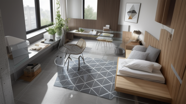 This interior scene marries modern aesthetics with functional design, creating a space that feels both expansive and cozy. The room employs a balanced mix of natural wood tones and muted greys that exude warmth without overwhelming the senses. A geometric patterned rug anchors the open floor plan, delineating the sleeping area from the rest of the living space without the use of obstructive walls. This open layout allows for an organic flow between areas, making the space feel larger. Ample natural light, minimalist furniture with clean lines, and well-placed greenery breath life into the space. The artwork on the wall introduces a minimalistic yet playful element, adhering to the understated color scheme while adding visual interest.