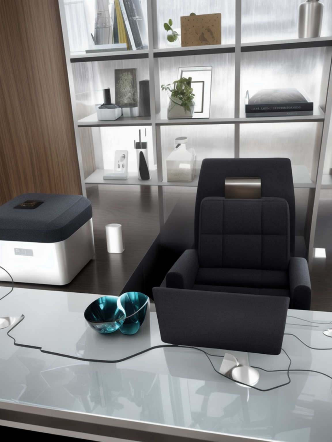 As we step into this modern abode, the harmonious blend of sleek lines and tailored functionality immediately catches the eye. A key element here is the strikingly minimalistic shelving unit that stretches gracefully along the wall, crafted from a light wood that adds warmth to the space. It's carefully curated with a blend of personal artifacts, books, and greenery, which serves not only as storage but also as a focal point that reflects the homeowner's personality. The central seating area, anchored by a sophisticated, deep-toned armchair, emphasizes comfort without compromising on style. This chair, with its structured silhouette and inviting upholstery, is set against a reflective glass coffee table, whose irregular shape and fluid design injects a touch of avant-garde artistry into the room.