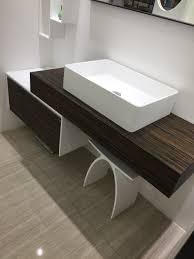 Recreating this sophisticated look at home involves a focus on a few key elements. Start by selecting cabinetry or shelving in a similar warm wood finish, which you can source from retailers specializing in contemporary furniture design. Companies like IKEA offer a variety of options that can be modified to achieve a custom appearance. Opt for dark, matte wall finishes to mimic the texture and color contrast seen here. For the atmospheric lighting, incorporate LED strip lights—available at most home improvement stores—under the edges of your cabinetry and shelves. Lastly, incorporate hardware-free drawers for that sleek, uninterrupted look, or seek out flush cabinet pulls to keep the cool, minimalist vibe. Shop at places where you can find modern, clean-lined fixtures, like Home Depot or your local specialty kitchen showroom to find the sink and countertop materials that align with this design's undisturbed elegance.