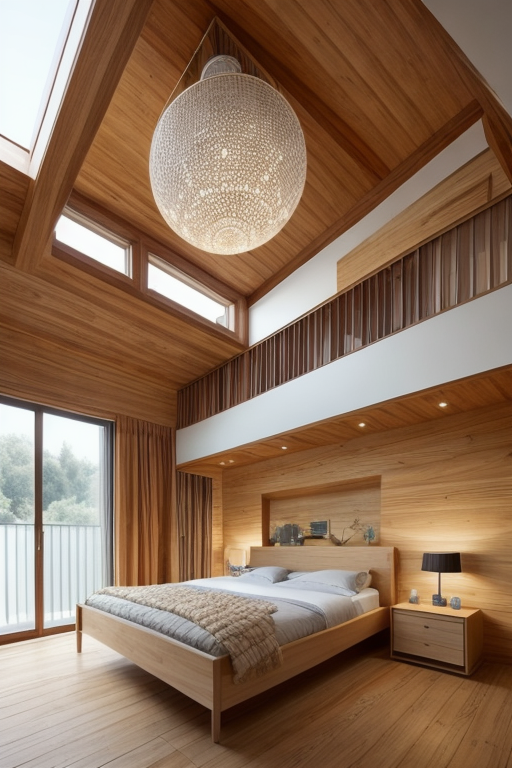 To recreate this serene bedroom oasis, start by focusing on the foundation: natural materials. Look for solid wood furniture pieces that speak to a contemporary aesthetic, available at stores like West Elm or Crate & Barrel. Consider a platform bed and matching side tables in a lighter wood finish to keep the room feeling airy. For the walls, if actual wood paneling is beyond your budget or practical reach, textured wallpaper in a wooden motif can be an effective alternative. The lighting is key — invest in a central pendant light with a unique texture or pattern, which can often be found in artisan shops or on websites like Etsy, to mimic the bespoke quality seen here. Fabrics should be kept simple and in a neutral palette, but always think about texture; a chunky knit throw or linen curtains can add layers of interest. Remember, the goal is to create a cohesive, natural, and relaxed environment, so keep colors subdued and let the materials and craftsmanship shine.