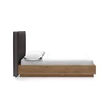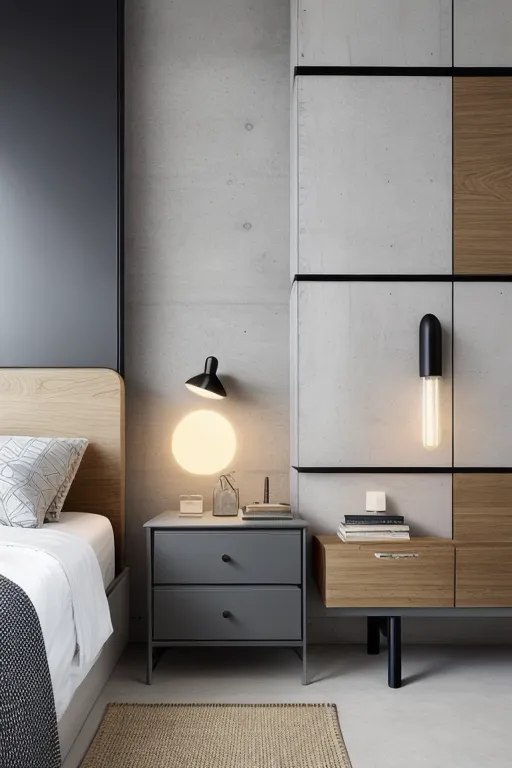 The interior depicted strikes a harmonious balance between minimalism and warmth, showcasing a sophisticated palette of materials. The raw texture of the concrete wall creates an industrial backdrop, which is softened by the warm wood tones of the built-in cabinetry and the bedside table. An interplay of geometry is seen in the linear structures and rectangular forms of the furniture, which stand against the organic curves of the bedside lamp. The restrained color scheme is enlivened by well-thought-out lighting that casts a welcoming glow and adds depth to the space. Complementing the composition, a woven rug adds a tactile element that invites a sense of comfort into the room.