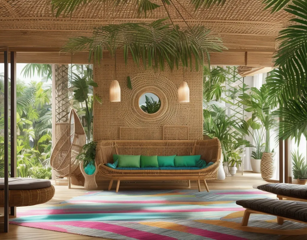 Embracing natural materials and biophilic design principles, this interior presents a seamless blend of artisanal charm and serene, lush aesthetics. The space is thoroughly anchored by the robust rattan surfaces, from the grand, woven wall feature embracing a simple, circular mirror to the inviting curve of an expansive sofa. Complementary to the rattan are the subtle wood elements that appear in the low-profile coffee tables, flooring, and the framing of the generous windows, which beckon natural light to dance across the lively, multicolored striped rug that adds vivacity to the room. This vibrant textile underscores the space's organic energy, a stark contrast to the calming greens of both the plush sofa cushions and the abundant leafy plants that forge a connection to the outdoors, enhancing the feel of an exotic retreat.