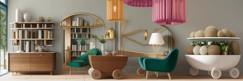 The image showcases a sophisticated blend of mid-century modern furniture with playful, contemporary design elements that create a cozy yet stylish space. The varying textures and the vibrant juxtaposition of colors—note the rich teal armchairs and the warm wooden tones—bring depth and character to the room. Strategic placement of decor, such as the spherical objects on the coffee table and the curated assortment of books and vases on the open shelving, infuses personality while maintaining a clutter-free environment. The eye is drawn upwards by the vertical lines of the bookcases and the hanging pink pendant lamps, which serve the dual purpose of art and illumination. The geometric shapes found in the mirrors further expand the visual space, reflecting the natural light that streams through the large windows.