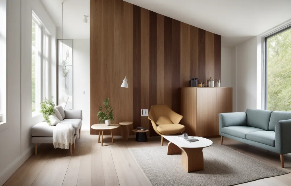This elegantly composed living space stands as a testament to the harmonious blend of modern design and organic warmth, achieving a sense of balance and tranquility. The contrasting material palette—with a dominant wooden wall feature that exudes natural warmth—is expertly juxtaposed with the crisp white walls and sheer window treatments that amplify natural light. A minimalist approach grounds the design, marked by sleek, unfussy lines of the Scandinavian-inspired furniture, like the iconic accent chair, understated couch, and clean-lined coffee table. Soft textiles add comfort and a touch of homeliness, while potted greenery brings a breath of life, tying together a look that is at once contemporary and inviting.