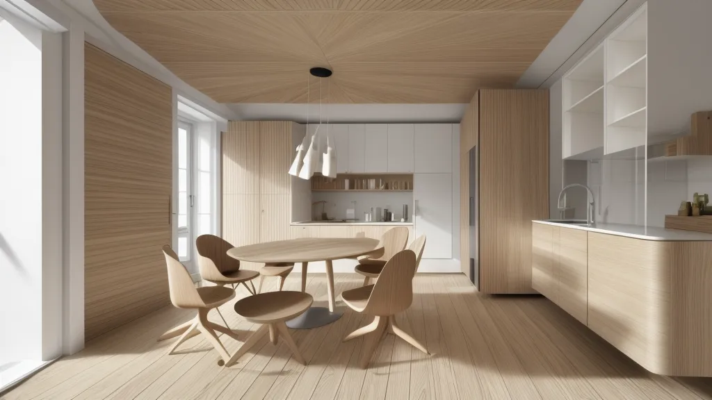 The harmony of natural wood tones and refined simplicity marks this interior, crafting a serene and inviting atmosphere. Abundant natural light floods the space, accentuating the straight lines and minimalist aesthetic of the furniture and fittings. The wood texture lining the walls and ceiling creates coherence, presenting continuity that ties the distinct kitchen and dining areas together seamlessly. The design hinges on a principle of unity—wooden elements resonate across surfaces, from the dining chairs to the kitchen cabinets, punctuating the light-filled room with warmth and organic elegance. Meanwhile, the subtle contrast between the pristine white of the kitchen countertop and the rich wooden tones delivers a balance that is aesthetically appealing and contemporary.