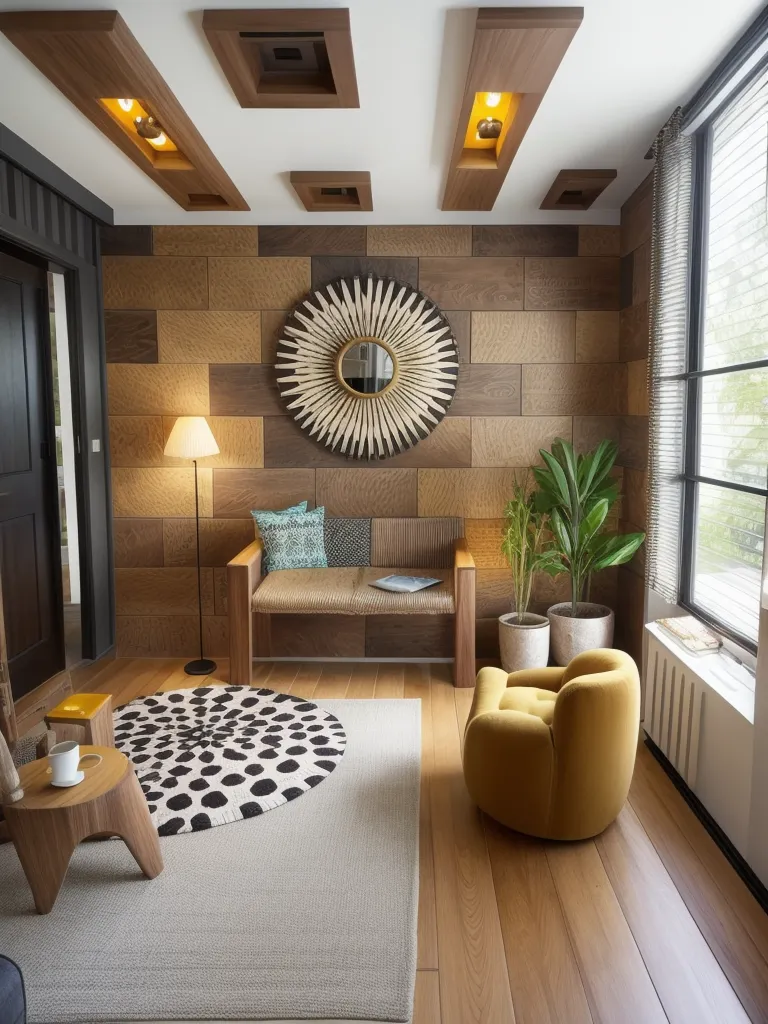 This cozy interior showcases a harmonious blend of warm wooden tones and textures, creating an inviting and balanced space. The room is anchored by a light hardwood floor, which extends to the wood-paneled walls, instilling a sense of continuity. Above, the ceiling features unique recessed wooden squares with warm yellow lighting, adding depth and architectural interest. The central focal point is a striking sunburst mirror, which not only reflects light but also adds a sense of spaciousness. Furniture is thoughtfully arranged: a sleek bench with patterned cushions sits against the wall, paired with a curved, mustard-yellow accent chair that injects a pop of vibrant color. Planters with leafy greens infuse the room with life, and the area rug with polka dots provides a playful contrast to the room's clean lines and natural materials.