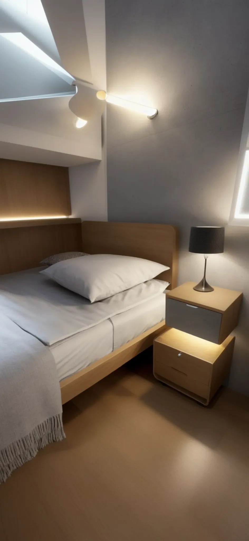 Embracing simplicity and warmth, the interior presented is a masterclass in minimalist design that never feels austere. Key elements that make this space work include the harmonious blend of soft ambient lighting with natural wood tones, creating a serene and inviting atmosphere. Notice how the wooden bed frame and side furniture lend a sense of organic coziness, while the sleek lamp adds a modern touch. The strategically placed lights highlight the room's texture and lines, creating a dynamic yet peaceful space that encourages relaxation. The understated color palette, consisting primarily of muted beiges and browns, alongside the crisp white bedding, contributes to the calming visual flow of the room.