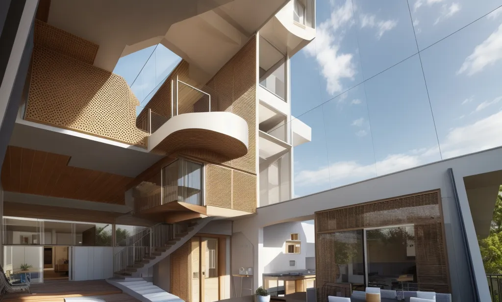 In the orchestrated symphony of modern design, the interior pictured highlights an artful blend of natural materials paired with contemporary architecture, creating a warm yet cutting-edge aesthetic. Central to the space is the harmony between wood and glass, where the rich, earthy tones of wooden panels and staircases provide a tactile contrast to the clean, sheer expanses of glass that invite ample daylight into the space. The interior effectively utilizes the vertical space with the dynamic lines of the staircase and balustrades leading the eye upward, while the punctured patterns within the woodwork add an element of intricate detail. Retractable glass doors seamlessly connect the indoor and the outdoor, offering a fluid transition that underscores modern living's focus on openness and natural light.