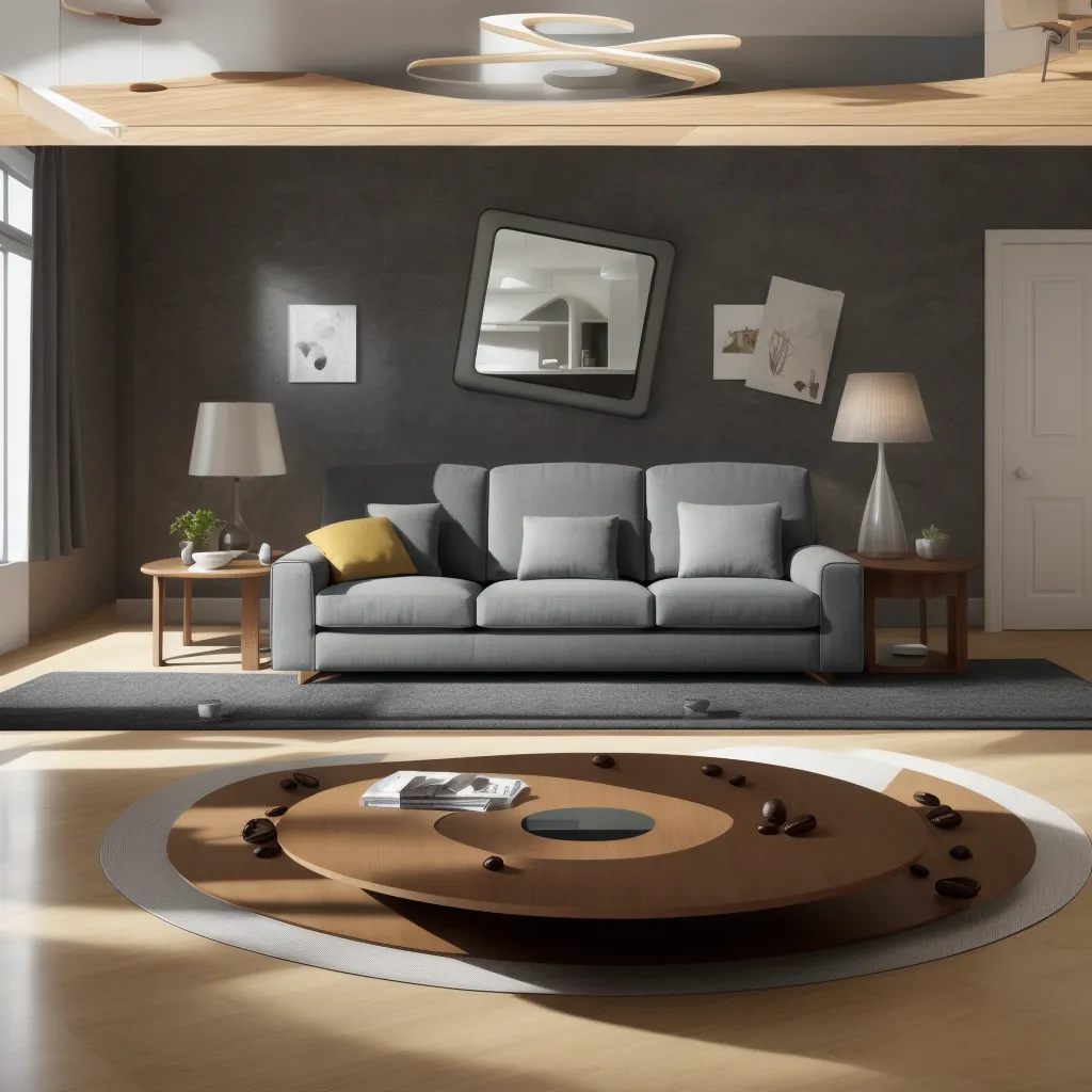 The room's design utilizes a refined palette of neutral colors, where the juxtaposition of warmer wood tones with the cooler shades of the furniture creates a sense of balance and harmony. The sleek, modern sofa, upholstered in a subdued shade of gray, serves as the centerpiece, inviting relaxation. Its clean lines are echoed throughout the room—from the simple, elegant floor lamp to the minimalist coffee table at its heart. Incorporated are also thoughtful lighting choices, embodied by the avant-garde ceiling fixture, which add layers of ambient light, further enhancing the room's modern aesthetic. The clever positioning of mirrors not only expands the visual space but also reflects light, creating a brighter, more open feel. The careful arrangement of wall art adds personality without overwhelming the space, contributing to the well-curated look.