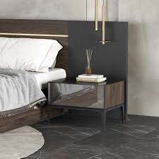 The bedroom in the image exudes a sense of calm modernity, achieved through a minimalist approach paired with a subtle interplay of textures and a monochromatic color palette. The choice of concrete for the walls sets a strong, industrial backdrop, balanced by the warmth of wood in the furniture and door, creating a harmonious blend of materials. The clean lines of the platform bed, with its elegant black-framed headboard, complement the room's geometry, while the simplicity of the bedding ensures attention is not drawn away from the room's architectural qualities. Strategically placed lighting, such as the bedside lamp with its classic design, offers both functionality and an additional layer of sophistication.