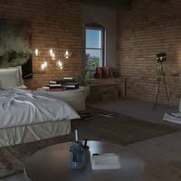Nestled within an urban loft space, we find an interior design that masterfully blends the raw charm of industrial aesthetics with the warmth of home comfort. The bedroom, framed by time-worn brick walls and a high concrete ceiling, is grounded by a striking black metal bed that lends an unrefined yet sophisticated edge. Textured linens in neutral tones soften the bed, juxtaposing the metal's hardness and introducing an inviting layer of tactility. Nearby, the symmetrical placement of minimalist furniture, like the side tables and bookshelves, exhibits a harmonious balance, echoing the structure's original utilitarian ethos. Oversized pendant lighting and mounted sconces further punctuate the space with a functional, workshop-inspired glow.