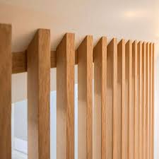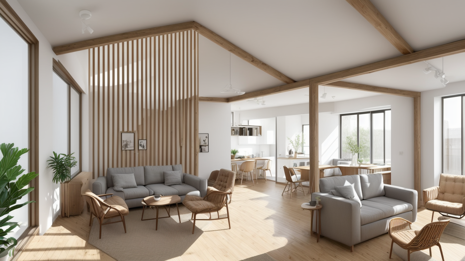 The interior showcased here exudes a warm and inviting atmosphere created by the harmonious blend of natural materials and light. Wooden elements play a pivotal role, with exposed beams, a slatted wall divider, and Scandinavian-inspired furniture pieces providing organic warmth and texture. The continuity of wood from the flooring to the ceiling suggests cohesion and creates a seamless flow of space. The layout is open and airy, with plenty of natural light flooding in through large windows, which not only enhances the sense of spaciousness but also establishes a connection with the outside environment. Soft furnishings in neutral tones complement the wooden accents, while green plants add a touch of nature's palette, enhancing the overall feeling of tranquility.